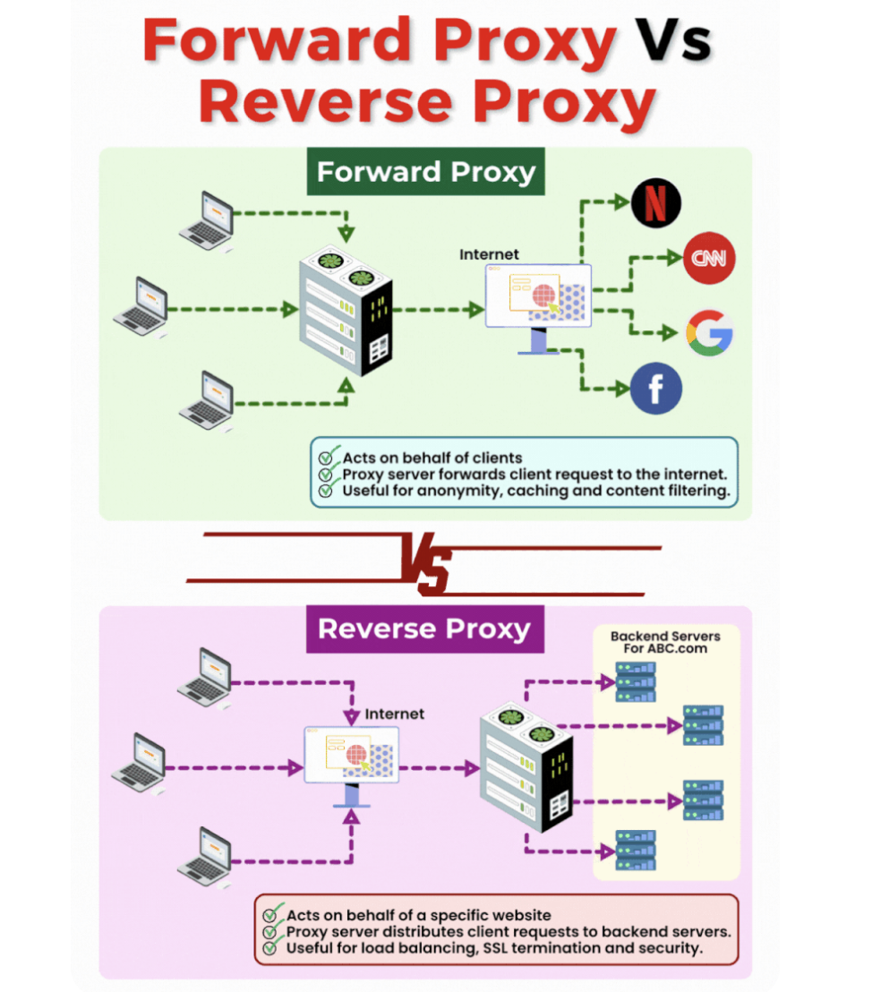 Key Difference: Forward proxies protect clients, reverse proxies protect servers.